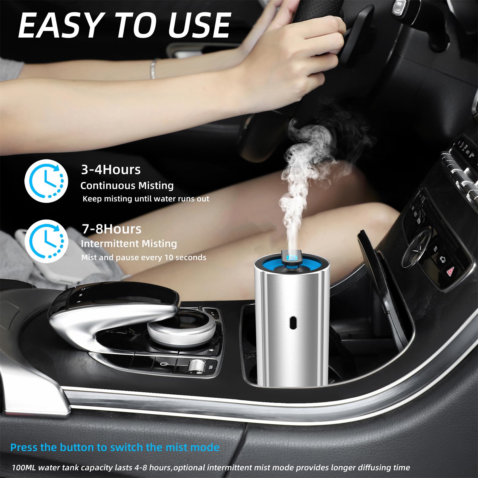 - SAFETY & CONVENIENT:Vehicle aromatherapy diffusers have two spray modes: continuous and intermittent. It has a waterless shutoff function, which is a safety feature. It ensures automatic shutdown to prevent dry burning when the water in the tank is depleted. Intermittent spray(spray10 seconds, pause 10 seconds) lasts about 8 hours. It is simple to operate and convenient to use.
