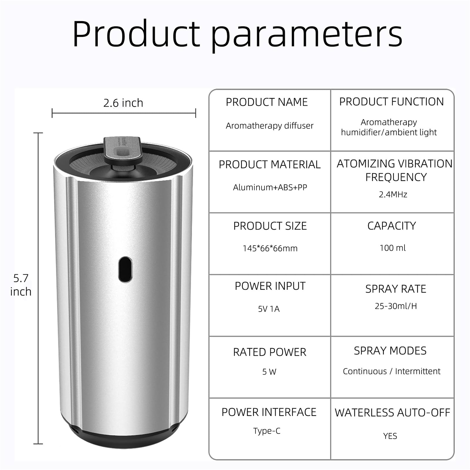 Aluminum Car Diffuser Essential Oil Car Aromatherapy Humidifier 100ml Personal Vehicle Scent Freshener Cool Mist Mini Portable Ultrasonic Diffuser with Colorful Lights for Small Space (Silver)