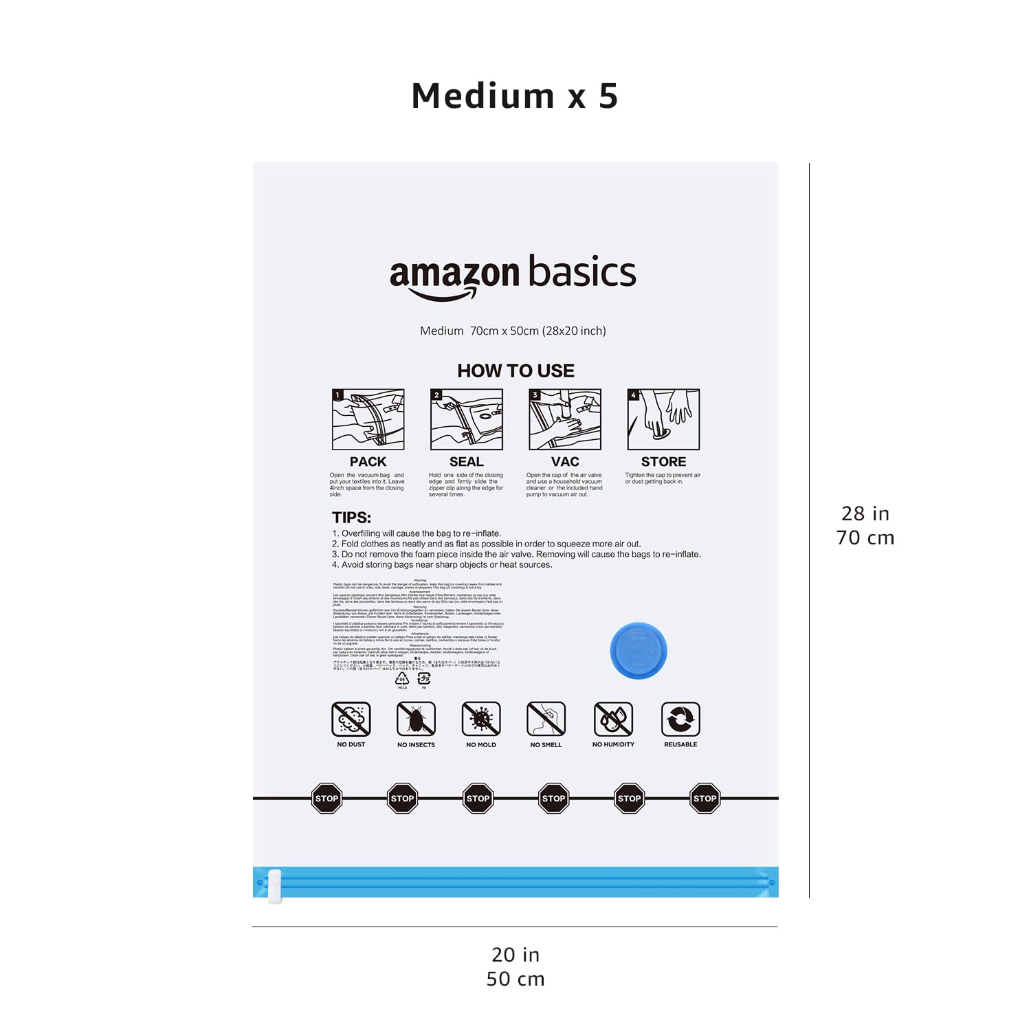 Amazon Basics Vacuum Compression Zipper Storage Bags With Hand Pump, Medium, Clear, 5-Pack, White, Sky Blue