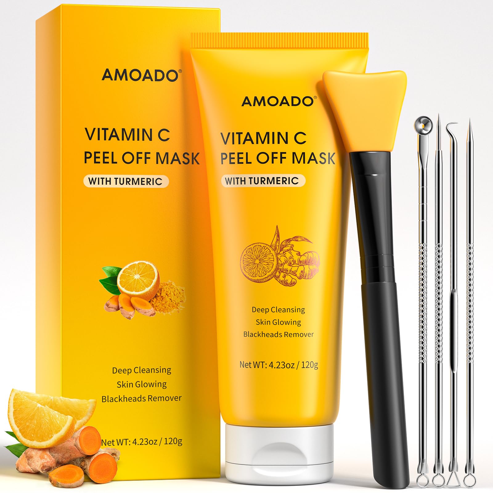 AMOADO Blackhead Remover Mask, Peel Off Face Mask with Vitamin C & Turmeric for Men and WomenâDeep Cleansing Nose Facial Mask for Blackheads, Pores & Oil Control with Pimple Extractor and Brush