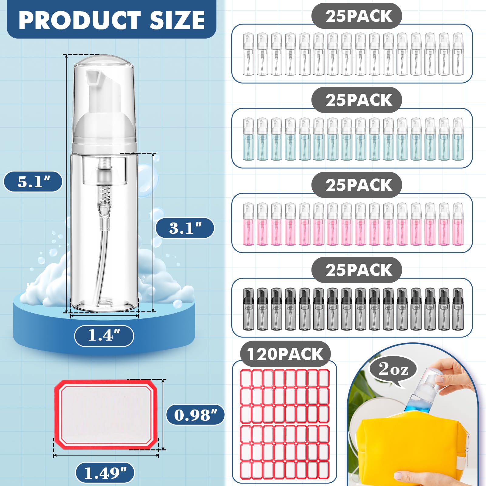 - 【Package Include】- You will get 100 pcs 2oz foam pump bottles and 120 pcs labels that help you easy to mark contents. Our foam bottles are made of clear PET plastic, lightweight yet sturdy, ensuring long-lasting use.
