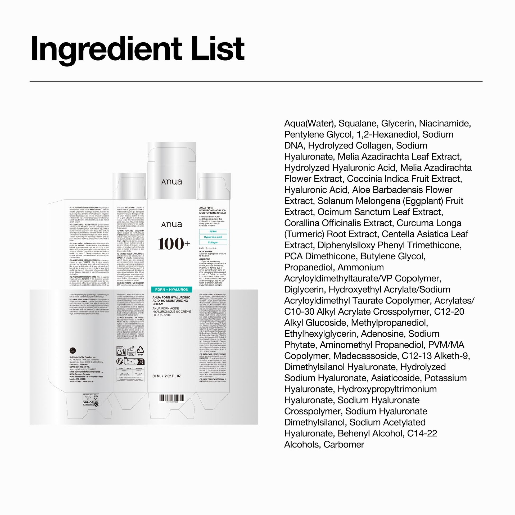 ANUA PDRN Hyaluronic Acid 100 Moisturizing Cream, Lightweight Hydrating Moisturizer with Salmon PDRN, Hyaluronic acid, Collagen for Glass Skin, Korean Skin Care (60ml / 2.02 fl. oz)