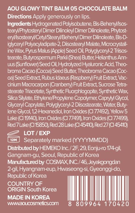 AOU GLOWY TINT BALM Tinted Lip Balm with Natural Gloss Instant Hydration for Chapped Lips 0.12Oz (05 Chocolate Balm)