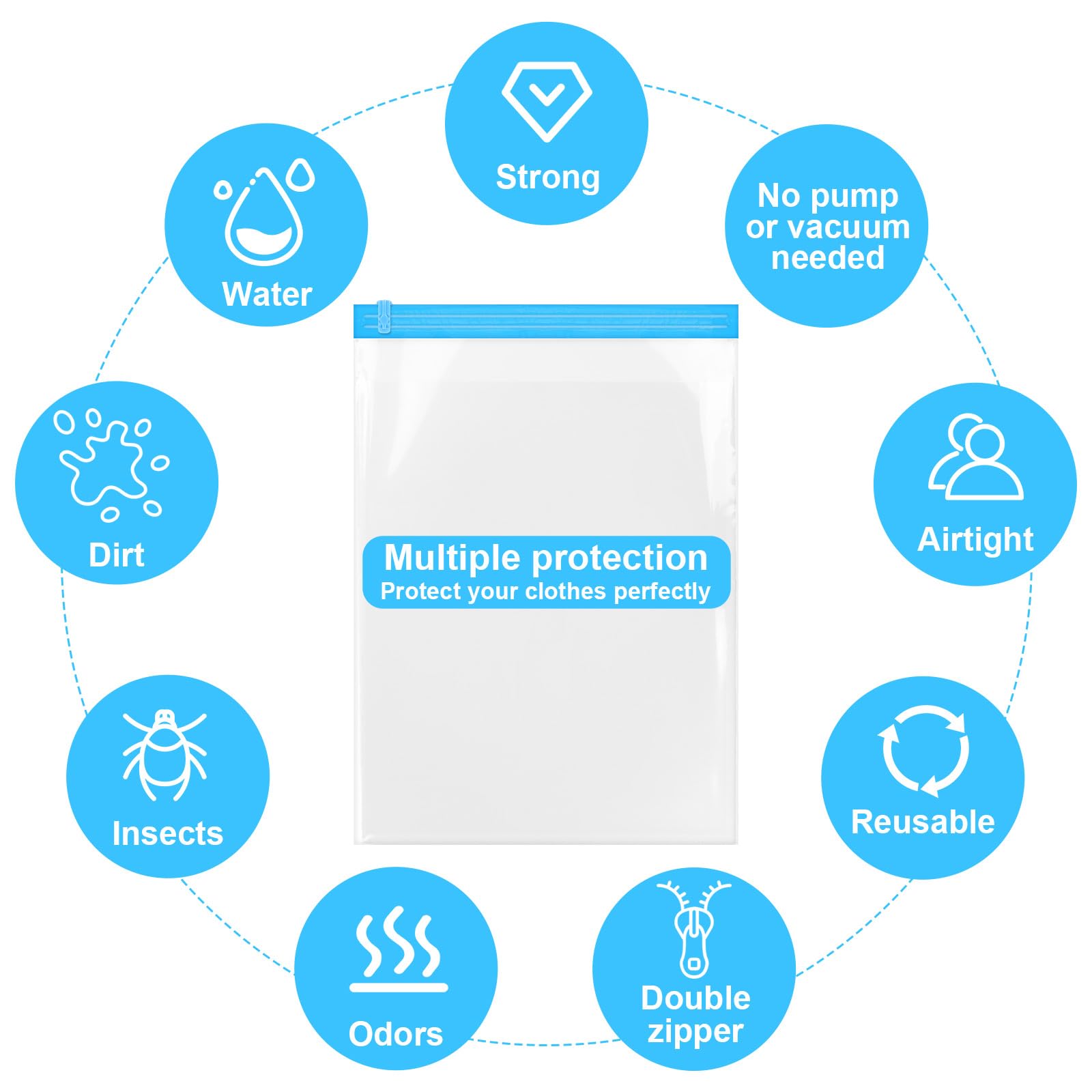 - Space Saving: Space saver bags are sealed with double zippers to prevent leakage. It can save more than 75% of storage space. Practical travel compression bags can effectively help you store clothes and items, and can shrink expanded items to save more space, keep your suitcase or wardrobe organized, and make better use of space.