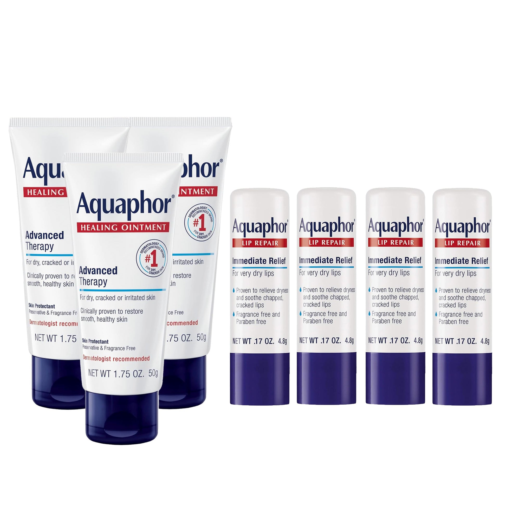 - INCLUDES: Three (3) 1.75 ounce tubes of Aquaphor Healing Ointment Advanced Therapy Skin Protectant and four (4) 0.17 ounce Aquaphor Lip Repair Lip Balm Sticks