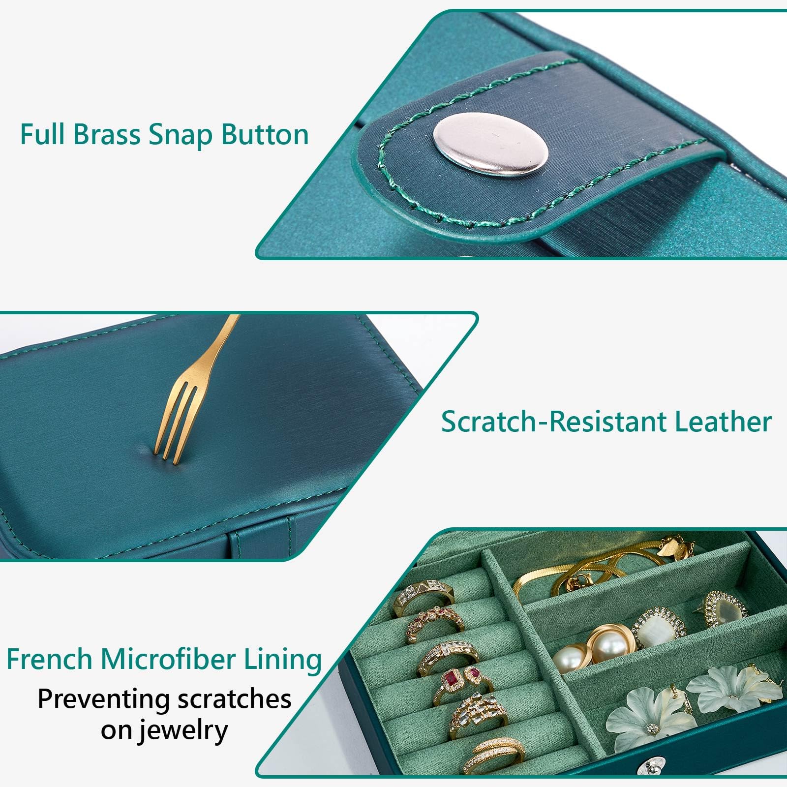 - LUXURIOUS APPEARANCE & HIGH-QUALITY MATERIALS: The travel jewelry case organizer is decorated with marquetry work, when assembled, they fit together to the nearest tenth of a millimeter to create a unique surface. The customized leather is water-stain-scratch resistant. Interior with Velvet lined interior and microfiber lining. The snap is made of copper alloy, each snap is polished for a smooth surface, easy to open and close, stays closed securely even after opening and closing 100,000 times.