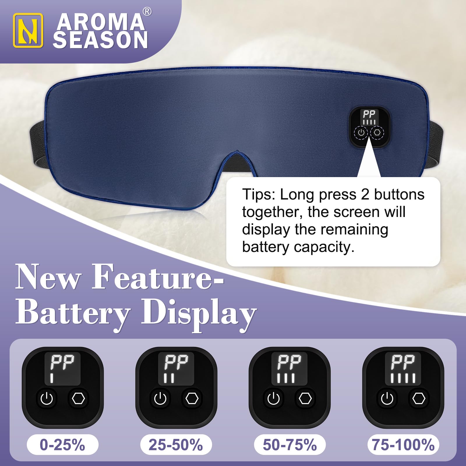 - 【Temperature and Time Control with Screen】Aroma Season heated eye mask provide 4 heating modes from 104°F to 140°F and 4 Time Levels from 15 to 60 minutes.It features a temperature time controller with a digital display, allowing you to adjust the temperature and select the desired treatment time.