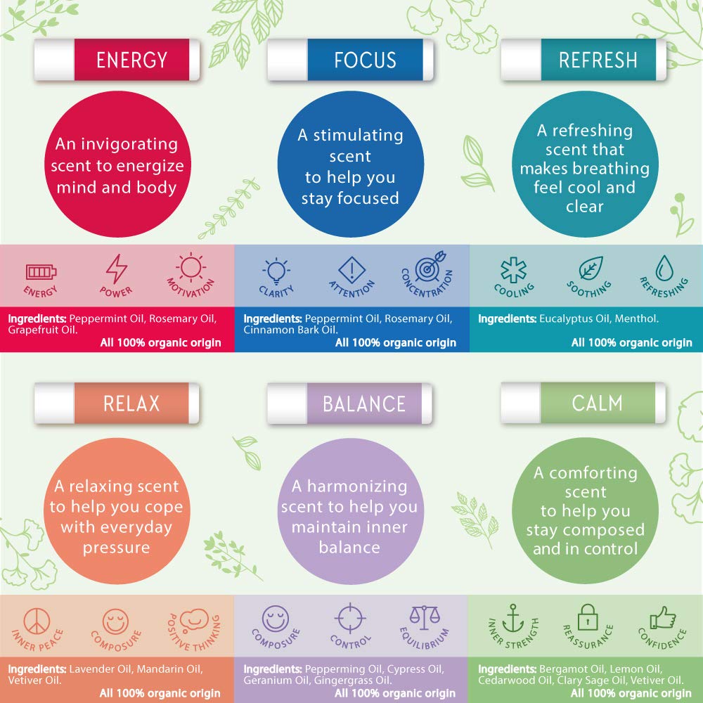 - [ Boost Your Mood ] The portable pocket size nasal inhaler is not just a tool to feel good, rather like a switch designed to control your mood instantly wherever/whenever. Boost FOCUS or ENERGY during work, study or sports and REFRESH to breath clearly. RELAX, BALANCE, or CALM yourself when dealing with stress, anxiety, or good night sleep.
