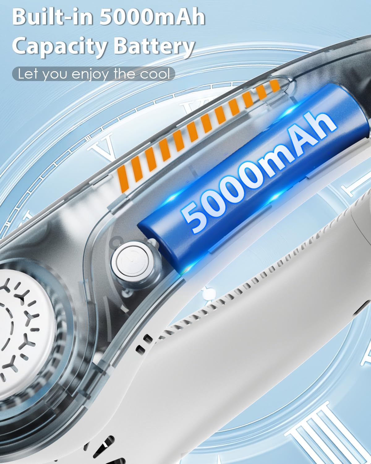 - 【Portable Hands-Free Fan】Designed for wearable convenience, this neck fans that blow cold air rechargeable weighs only 9.5 oz, it is 30% lighter than traditional neck fans. Around the neck fan ergonomic curved shape allows you to hanging neck fan effortlessly on hooks for quick access when heading out. Whether you're traveling or just leaving temporarily, cooling neck fan always within reach. When you're back home, it tucks away in seconds, saving space and keeping your area tidy