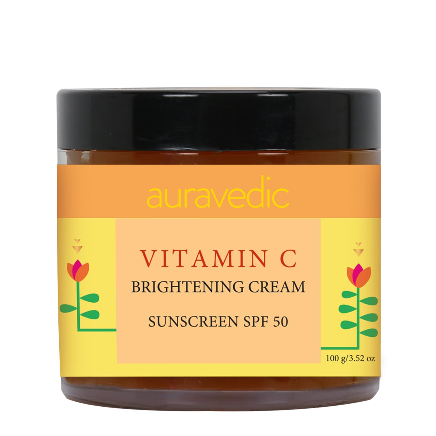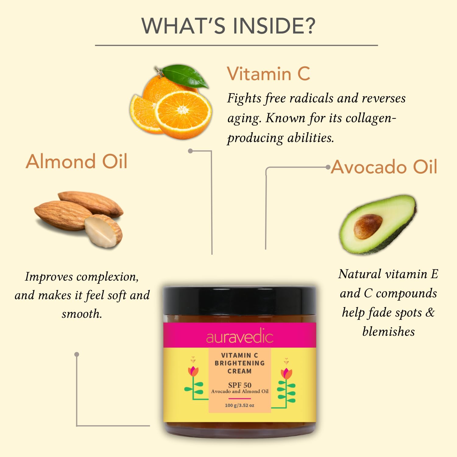 Auravedic Vitamin C Face Cream with SPF 50 for Glowing Skin | Reduces Sun Damage & Revives Dull Skin | Organic Hydration | Argan & Avocado Oil Infused Sunscreen Moisturizer | 3.53 Oz (100g)
