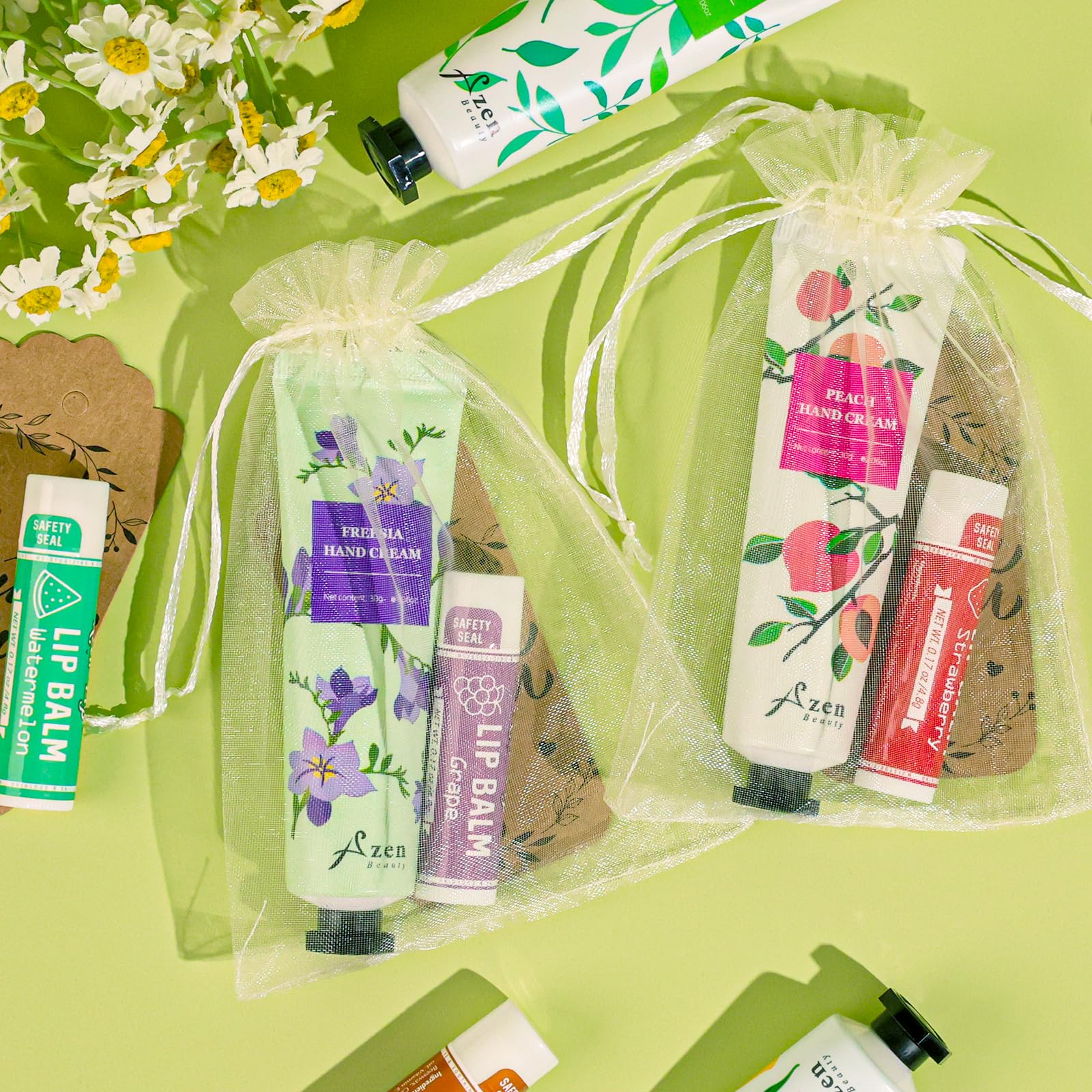 - Sufficient Coworker Gifts: This set includes 30 hand creams, 30 lip balms, 30 white organza bags and 30 thank-you labels. These are enough to share with family and friends during the wedding, and they are a good combination to meet your gift-giving needs