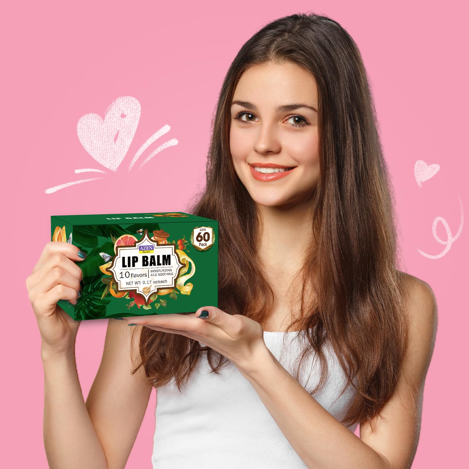 AZEN 60 Pack Natural Lip Balm, Moisturizing Lip Care Product for Dry Cracked Lips (C-60) - 10 Flavors