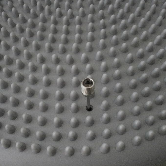 - Cushion is 13.5in / 34cm in diameter, large spiky dimples on one side for standing, and very small dimples on the reverse side for sitting.