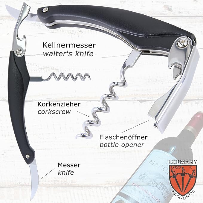 - CONTENTS: Tweezers, bottle opener/foil cutter/corkscrew, nail clipper, toe nail clipper, sapphire nail file.