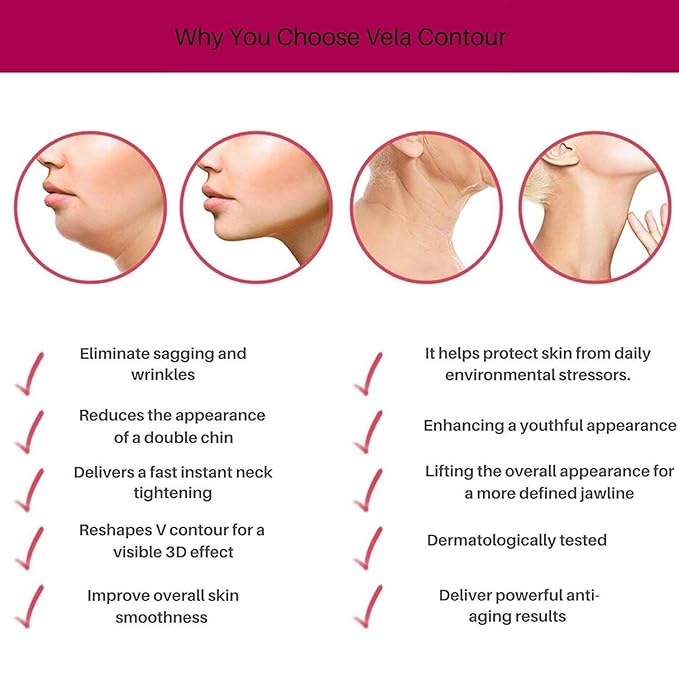 - ATTENTION! YOU MAY EXPERIENCE a slight warm sensation and instant lifting as you massage the serum onto the skin. RESHAPE YOUR FACE & NECKLINE, reduce the appearance of the sagging double chin, wrinkles, and fine lines. Vela Contour non-greasy neck serum instantly tightens the skin surface as it helps lift and firm skin for a more defined profile.