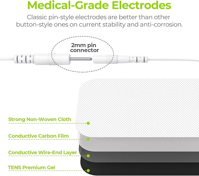 - Universal Compatibility: Standard 2mm connector TENS electrodes pads are classic and commonly used in the medical area, which makes it easier for you to find compatible TENS unit muscle stimulators and accessories. It is compatible with popular TENS and EMS units such as AUVON Rechargeable TENS unit, United Surgical TENS 7000, HeathmateForever YK15AB, Santamedical LFM-110, truMedic TENS machine