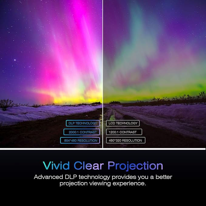 - Easy Portability Design Mini Projector: Compact and light weight design portable DLP projector built-in rechargeable battery and speaker. Powers via rechargeable battery up to 2.5 Hrs. Come with remote control and tripod, free of keep taking projector off the stand every time you need to turn it on/off or select something on the menu. Ideal for outside activities like small meetings/ gatherings or gaming time.