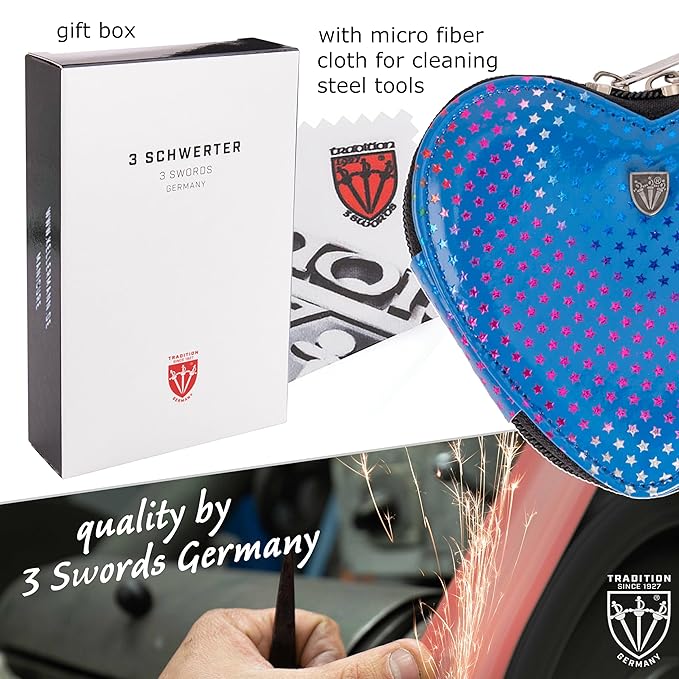 - STEEL IMPLEMENTS: Hand made, bright nickel plated (protection against corrosion), red laquered, polished and hardened. All cases come in an attractive gift box. Instruments are made by 3 Swords since 1927.