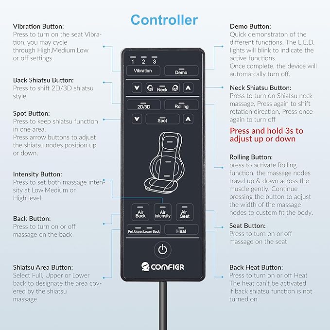 - Optional Heat & Adjustable Compression Massage - The full back massager has a heating pad that delivers gentle warmth to the back. ADJUSTABLE COMPRESSION-massage on waist & hips that you can choose. Adjustable 3 intensity settings are available.