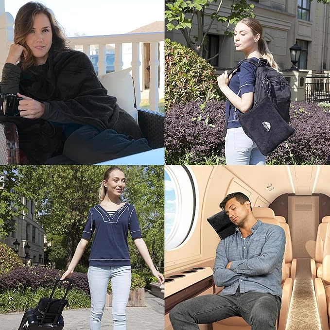 - Special Feature : Airplane Travel Accessories - Travel must haves for airplane as it weighs less than 1 lb, so you can just easily carry it around for long flights., Micro Plush Blanket - The black travel blanket features a unique patented design that keeps you warm and comfortable in all seasons., Plane Blanket Travel - The outdoor blanket is large and has a sleek, matching travel bag with a hand luggage belt., Travel Bag - This airline blanket is an easy-to-fold travel blanket and fits into our portable zipper pouch, Travel pillow blanket: Use it as a blanket or a pillow on planes, in RVs, in cars, on trains, along with the travel case. Airplane Travel Accessories - Travel must haves for airplane as it weighs less than 1 lb, so you can just easily carry it around for long flights., Micro Plush Blanket - The black t… See more
