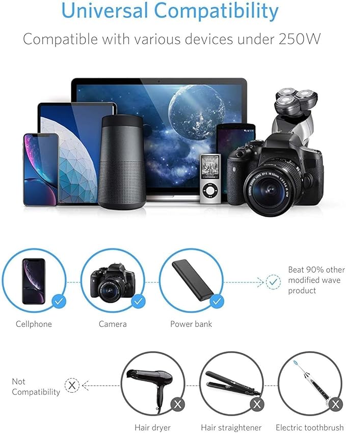 - Not compatible- hair dryer, hair straightener, coffee machine, etc. (Regardless of their wattage)