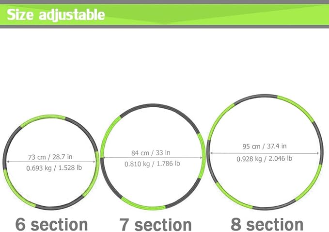 - SIZE ADJUSTABLE: according to your figure it can be adjusted. The package contains 8 sections, 1.9 pounds and measures 38 inches wide. We can remove 1 or 2 sections, and then set up 7 sections or 6 sections hoop.