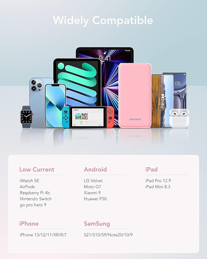 - đăHigh-Speed Chargingă: 25% charging speed faster compared to similar versions on the market. 4 smart USB outputs get the fastest charging by intelligently detecting and regulating the charging current. Provides a total 5.4A output to charge up to 4 devices simultaneously with Charmast battery pack. The versatile USB-C port supports fast input and output. Long-lasting portable charger for iPhone, iPad, Samsung Pixel More