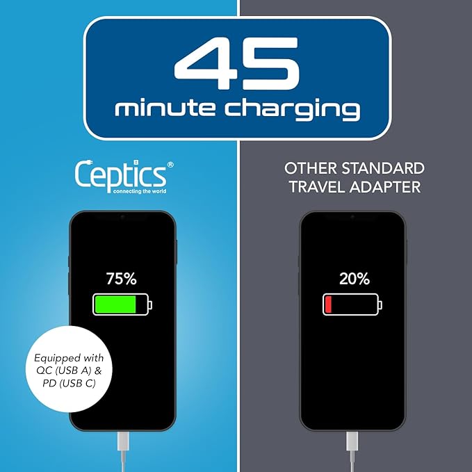 - [CHARGE 4 DEVICES AT ONCE] Ceptics India travel adapter supports Quick Charge 3.0 QC USB & PD USB-C 2 USA Input 1x USB & 1x USB-C (Total Max 3.1A) Perfect for fast charging cell phone iphone 11 iphone 11 pro camera laptop tablets ipads iphones chargers CPAP and power bank & more