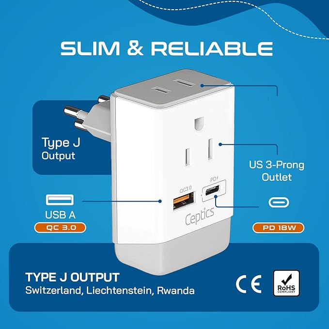 Ceptics Switzerland Plug Adapter, Travel with QC 3.0 & PD, Safe Dual USB & USB-C - 2 USA Socket Compact & Powerful - Quick Charge 3.0 & Power Delivery - Type J AP-11A - Fast Charging