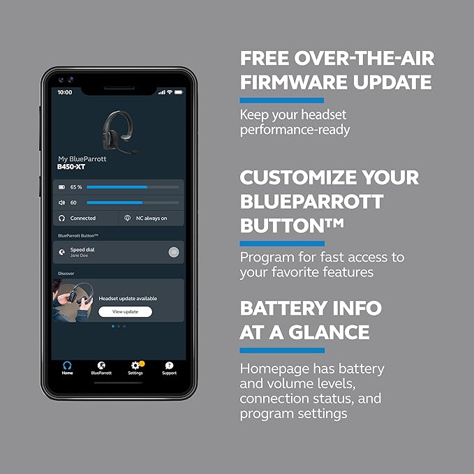 - EASY CUSTOMIZATION – The BlueParrott App provides easy firmware upgrades and feature selection, with no need to connect to a computer Plus, the customizable BlueParrott Button enables fast access to your favorite features such as mute, speed dial, and more