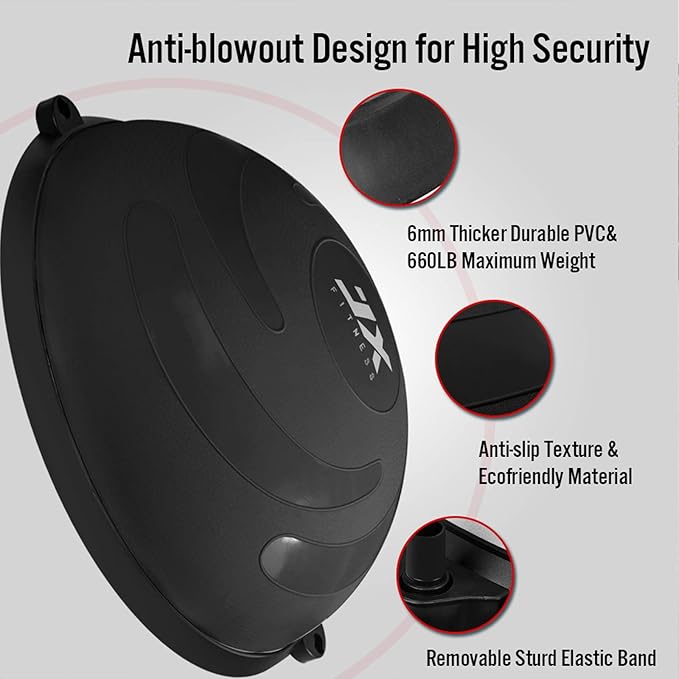 - UPGRADED DESIGN: The maximum weight bearing of JX FITNESS could up to 600 lbs which is twice than normal version. JX FITNESS Half Balance Ball as an upgraded version has a lot of improvements based on the traditional version including reducing the weight to 11.5lbs and thickening 5mm to surface.Many tested and verified anti-burst technology guarantees a safety use. These improvements make our JX FITNESS balance ball to be lighter, stronger and more portable.