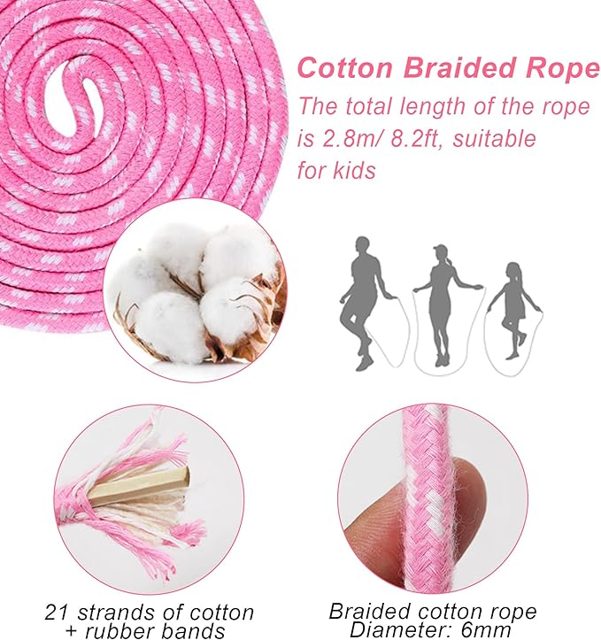 • Cotton Jump Rope: the rope of kids jump rope was made of soft cotton rope, not too light but not too heavy either, making it easy and comfortable for adults and children to use
