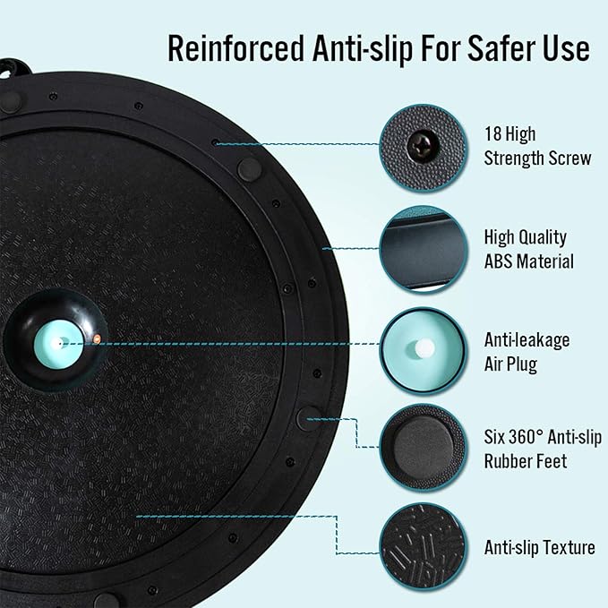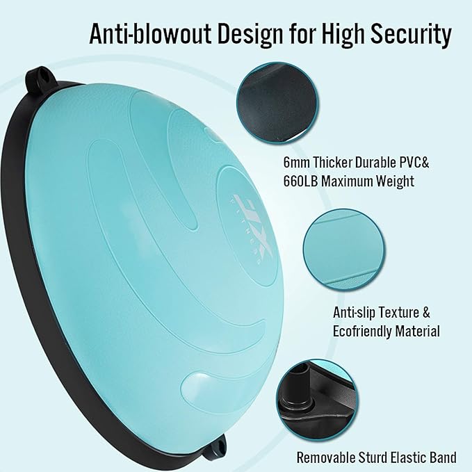 - ANTI-SLIDE & ANTI-BURST DESIGN --- JX FITNESS yoga half ball upgraded anti-skid texture surface & anti-slide base to improve users' stability. Wear-resistant ABS base plus 6 non-skid feet and anti-burst technology gives you additional safe guarantee that allows you to safely stand, jump, kneel, or lay on this balance trainer, for a worry-free workout. Guarantee safety during use even when you're sweaty. JX FITNESS balance trainer ball is made from durable rubber and sturdy, ABS plastic.