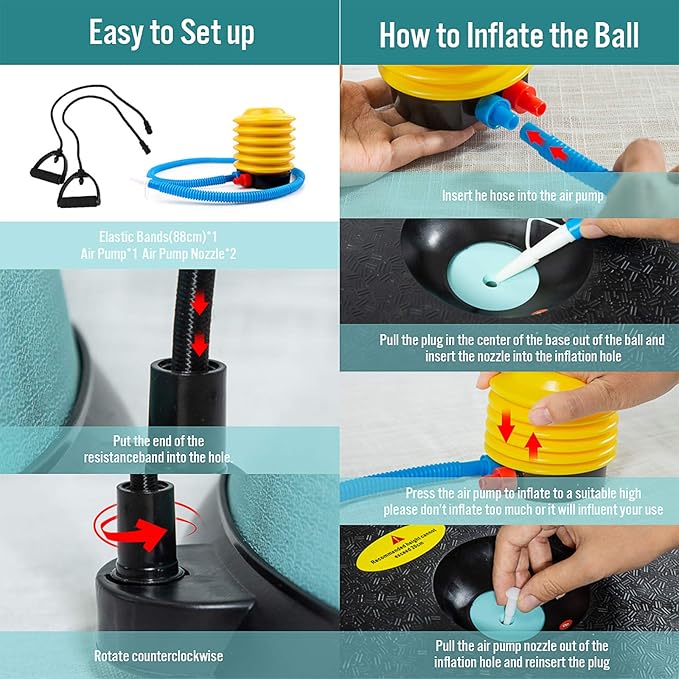- EASY INSTALLATION AND PORTABLE --- JX FITNESS Workout Ball Equipped with pump, convenient for inflating and deflating. Balance trainer is 23.6” Dia, 8.7” H and weighs 11.5 LBS, compactly sized and light weight for you to conveniently carry it to the gym, office, or beach to enjoy workout . Sleek,compact design allows for easy transportation and storage,and quick positioning for any type of workout.