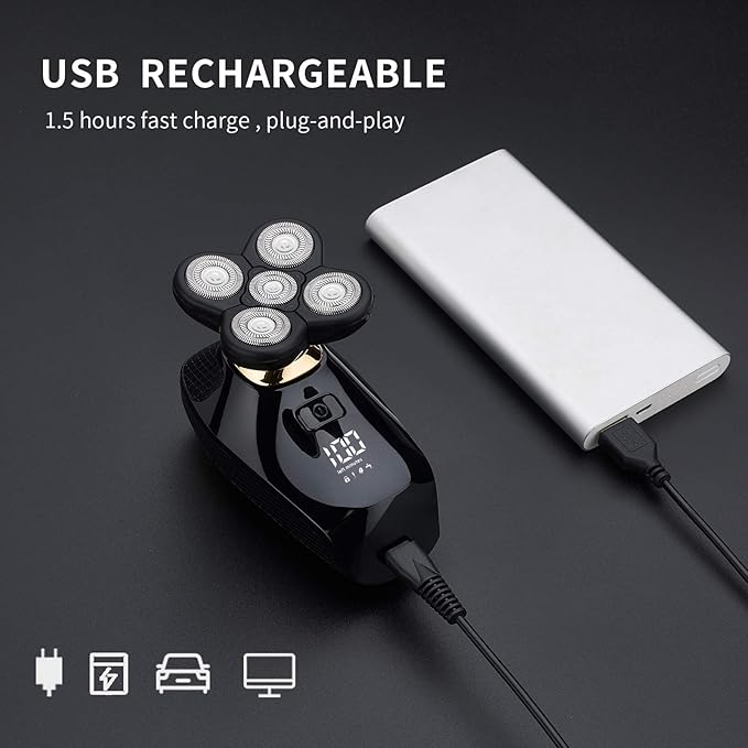 - ·【5 Flexible Shaver Heads for Close Shave】- 5 precision & close rotary blade heads of the razor adapts to the contour of your head and allows reaching more hair with every pass, resulting in smooth and close shave. An good choice for mens bald head shaving, ensures gentle close shave of the all areas of head and neck in few minutes.For a better bald look, please use the hair clipper first to trim the hair to less than 5 mm then use the head shaver.
