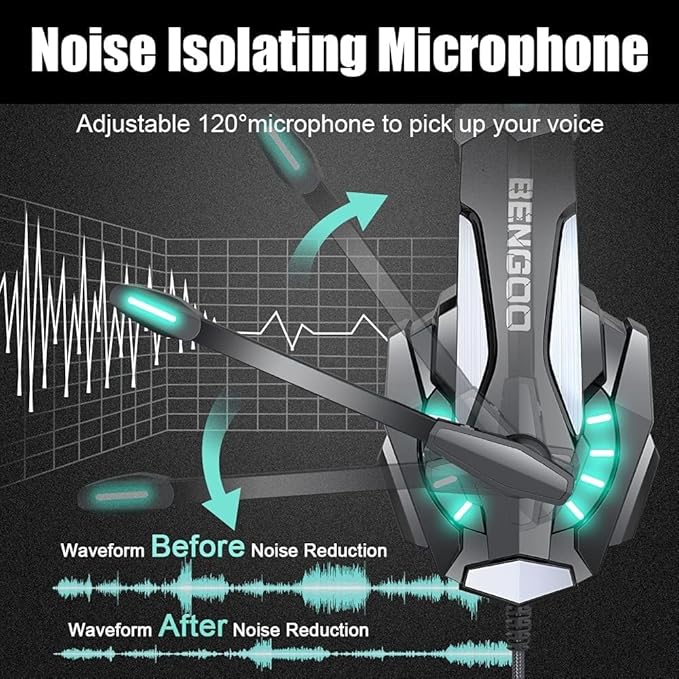 BENGOO G9000 Stereo Gaming Headset for PS4 PC Xbox One PS5 Controller, Noise Cancelling Over Ear Headphones with Mic, LED Light, Bass Surround, Soft Memory Earmuffs for Laptop Mac - Black