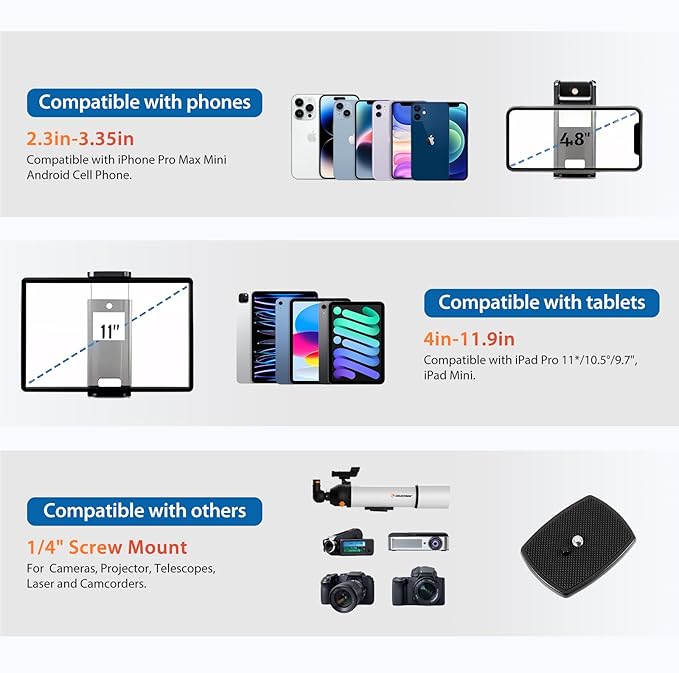 - 【Tripod for Camera ipad Phone】With standard 1/4" screw mount, our versatile tripod is perfect for all cameras, including DSLRs and compacts, such as Nikon, Canon, Fujifilm, and more. It's also compatible with various phones, featuring a 360° mount for iPhones and Androids from 2.2" to 7.5", even for iPad Air, and more. With added quick release plates and a wireless remote, capturing stunning photos and videos is a breeze