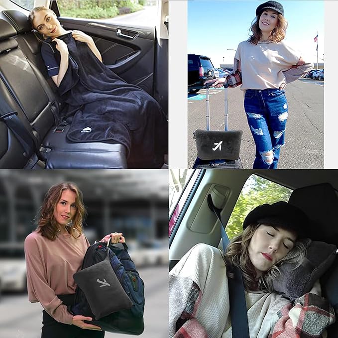 - Special Feature : Flight Travel Accessories - A warm plane travel blanket with a backpack clip for portability and convenience., International Travel Essentials-Travel Blanket doubles as a soft travel-size pillow for head or back support or during long flights., Small Travel Pillow - Together, the black travel blanket pillow and case offer a travel essential set that can be offered as a travel gift for your loved ones or friends., Travel Essentials - Soft Blanket comes with a hand luggage and a carabiner, making it ideal for flights, cars, trains, and camping., Travel Necessities - Packable travel blankets made of soft plush material are ideal for the outdoors, stadiums, and camping. Flight Travel Accessories - A warm plane travel blanket with a backpack clip for portability and convenience., International Travel Essentials-Travel Blanket doubles as… See more