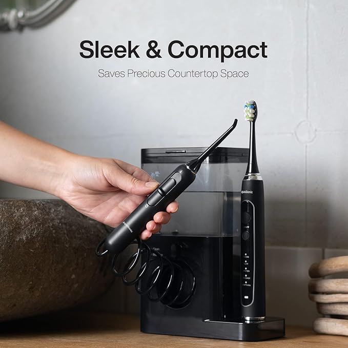 - What’s in the Box – 1 Home Dental Center Pro Countertop Setup, 1 Black Series Pro Electric Toothbrush, 6 ProFlex Brush heads, 2 water flosser jet tips, 1 tongue scraper, 1 power adapter, warranty card, and user manual.