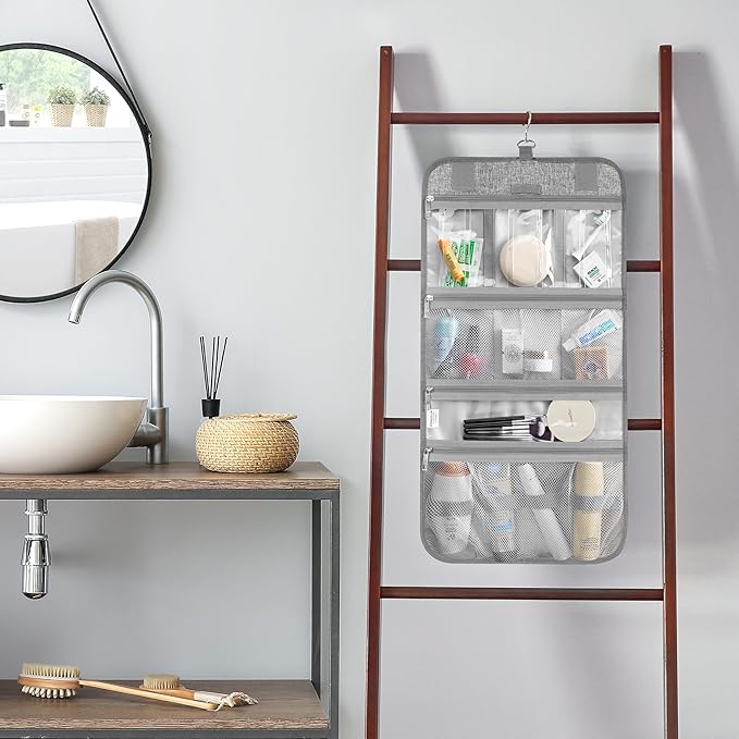 - WATER-RESISTANT & EASY TO CLEAN: Durable polyester with waterproof sections, just wipe clean. Perfect for storing travel-size shampoo, conditioner, face wash, toothbrushes, and even a full-size hairbrush. Keeps everything dry, tidy, and ready for any trip.