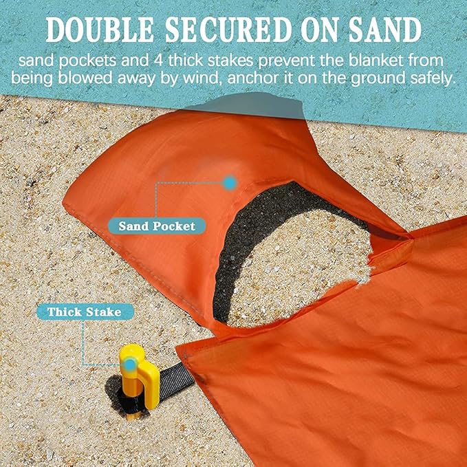 - LIGHTWEIGHT BUT STURDY -- This large beach blanket is lightweight and easy to carry on outdoor activities. It includes 4 stakes and 4 sand anchor pockets, plus a zippered pocket to store your valuables.