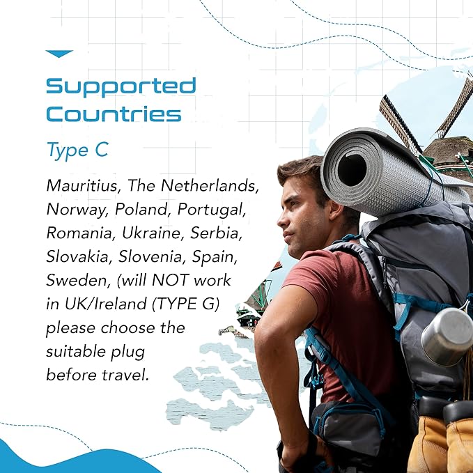 - [Type C] Supported Countries: Mauritius the Netherlands Norway Poland Portugal Romania Ukraine Serbia Slovakia Slovenia Spain Sweden (Note Will Not Work in UK/Ireland (TYPE G) please choose the suitable Plug before travel