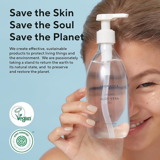 AROMATICA Organic Aloe Vera Gel (2 pack), After Sun Care and Sunburn Relief with Pure Aloe Vera Gel Face&Hair, Sun Burn Moisturizer EWG Verified (10.14oz/300ml)