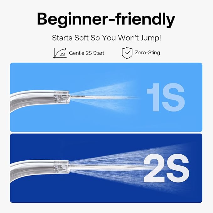- Perfect for Beginners & Sensitive Teeth: Our unique 2-second gentle start begins with a soft flow, giving you time to adjust and allowing gums to ease into the cleaning. This water dental pick eliminates the jarring shock of a sudden blast, ensuring a comfortable and confidence-building experience from the very first use.