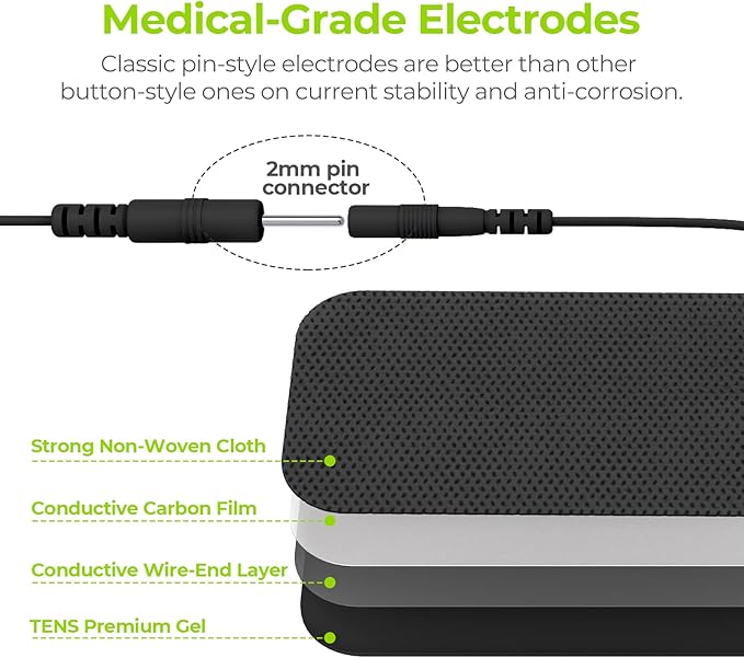 - Universal Compatibility. Standard 2mm connector TENS electrodes pads are classic and commonly used in medical area, which makes it easier for you to find compatible TENS unit muscle stimulator & accessories. It is compatible with the popular TENS / EMS unit such as AUVON Rechargeable TENS unit, United Surgical TENS 7000, HeathmateForever YK15AB, Santamedical LFM-110, truMedic TENS machine.