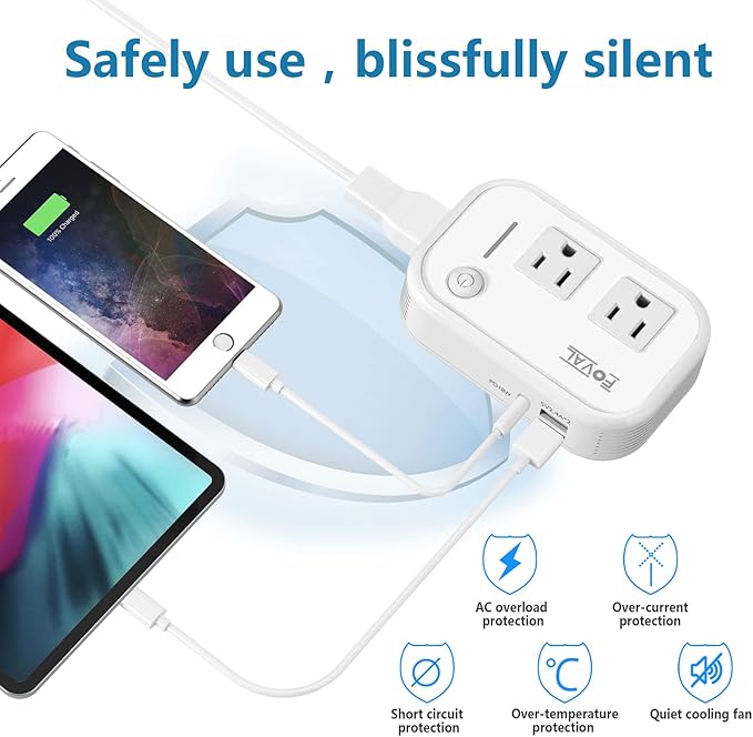 - 【Safe and Slient】Made of PC fireproof materials, Using Smart Chip, Certified by CE, FCC and RoHS industry standard. Quiet fan work and voltage converter will automatically shut down for surge protection, over-current, over temperature, output short-circuit. Protect devices and keep them working flawlessly. Warm reminder: *Do Not Use with Hair Dryers and Household Appliance over 230 watt.