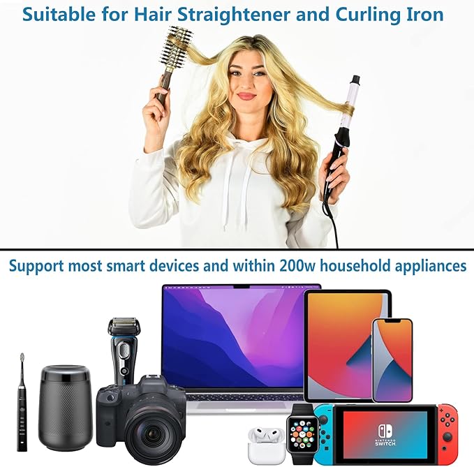 - 【Universal Compatible】Supply max up 230 watts power electric converter for international travel, electrical voltage converter perfect for hair appliances (hair straightener, flat iron, curling iron, hot air brush), and electric shaver/toothbrush, cell phone, camera, watch, laptop, bluetooth speaker, and other electronic devices.