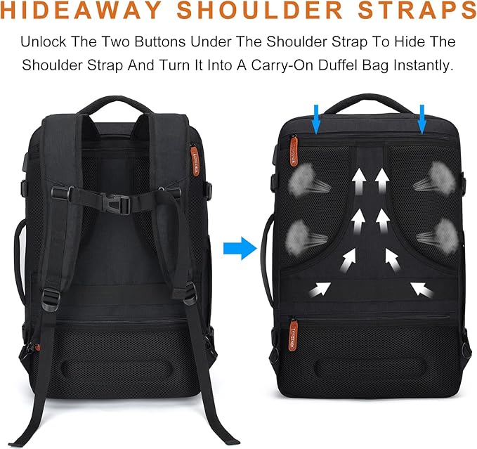 - LARGE CAPACITY & EXPANDABLE:This extra large travel backpack with expandable feature offers you more packing capacity up to 40L.Unzipping to get larger storage space then can easily hold packing cubes, make-up bag, outfits, camera bag and gear for 3~7 days of travel.The carry on backpack fits overhead and under seat while on state of standard carry on size, is ideal for men, women, weekend traveler, or occasional vacationer.