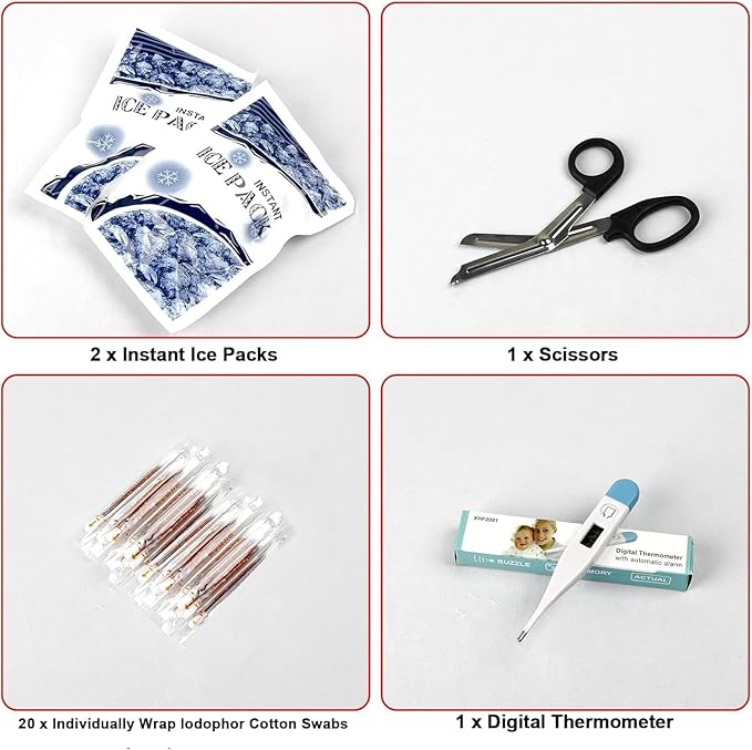 - First Aid Kit Survival Sets: Camping supplies comes with bandage adhesive strips, plastic scissors, emergency blanket, ice pack, and other multi-use items for any possible potential emergency, such as cold weather while traveling outdoors, accidental falls and sprains during sports, or accidental burns at work.