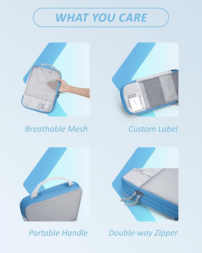 • True Space Saving - These compression travel cubes are kind of like how a vacuum sealer works. Done by adding an extra zipper around the outside that can be zipped up to help squash clothes down and minimize the space inside. It’s remarkable how much of a difference they can make. Help travelers “Fit Double the Amount” in their suitcases.